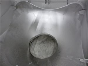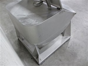 1x Sackentleerungsstation, Anag, Auslauf 48 cm Ø, Klappdeckel, Öffnung 12 cm Ø (für Staubabsaugung) oben, mit Gabelstapler transportierbar, Gesamtabmessungen 135 x 115 x 133 cm (lxbxh), gebraucht in der Lebensmittelindustrie