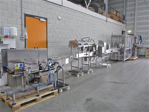 1x Abfüllanlage, Maschine zum automatischen Aufrichten, Füllen und Verschließen von Kartonverpackungen (Giebelkartons) inkl. Auslauflinie mit Metalldetektion, 2-seitiger Bedruckung und Kontrollwägung, exkl. Stand-alone Abfüllmaschine, Hauptkomponenten; Steven BV Kartonabfüllmaschine, Packungsentnahme, Packungsauffaltung, unteres Verschließen (Heizen und Kühlen), oberes Falten und Verschließen (Heizen und Kühlen), Kunststoff Slat Top Kettenförderer, Lock Inspection Systems (Loma) Insight Metalldetektor mit Auswurfsystem, 2x Linx Printing Technologies 7300 Inkjet Drucker, Loma Systems CW3 Kontrollwaage mit Auswurfsystem, Dokumentation, eingesetzt in der Lebensmittelindustrie zum Abfüllen von 0,5 und 1 Liter Milchkartons